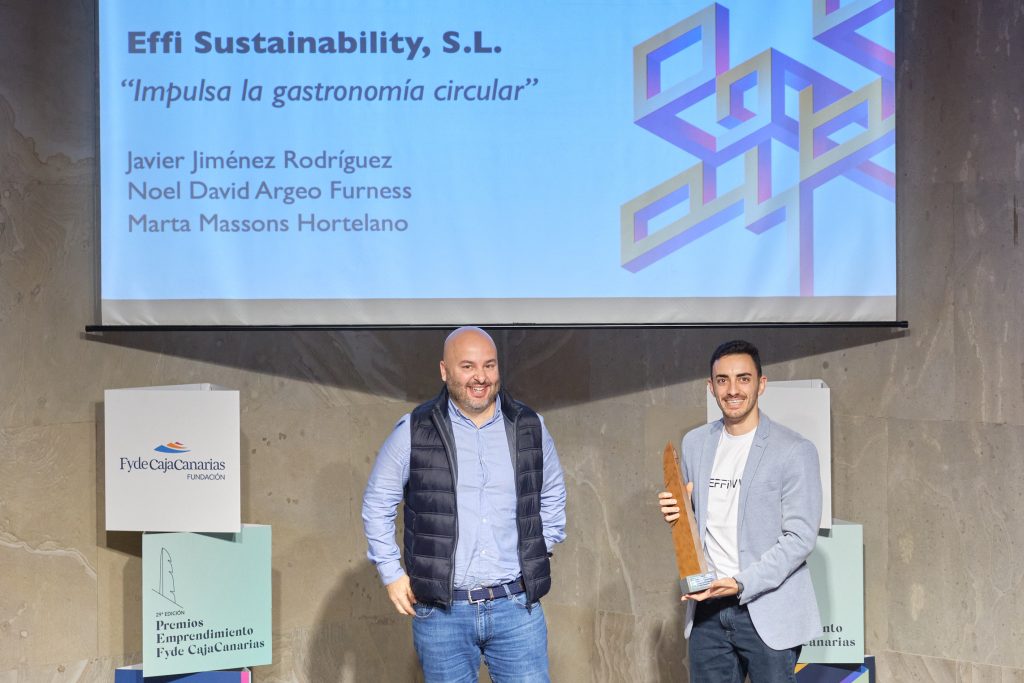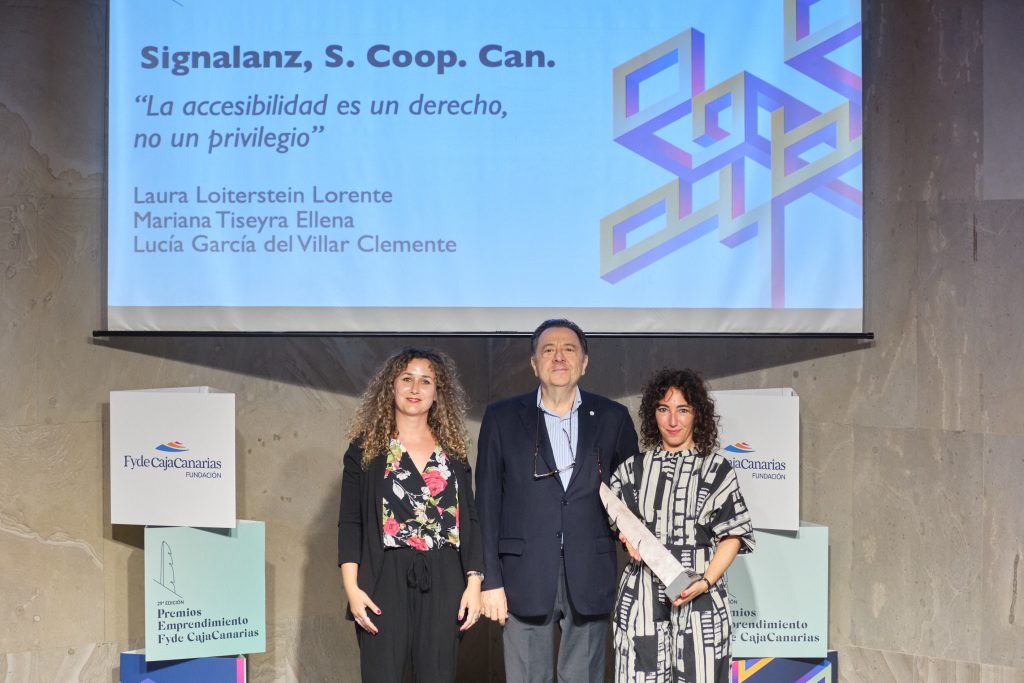 Los Premios Emprendimiento Fyde CajaCanarias 2025 reconocieron el trabajo de dos proyectos destacados. Por un lado, Effiwaste, promovido por Javier Jiménez, Noel Argeo y Marta Massons, centrado en impulsar modelos de gastronomía circular y sostenible; y, por otro, Signalanz, fundada por Laura Loiterstein, Lucía García y Marina Tiseyra, iniciativa que da respuesta a las necesidades de interpretación y soluciones lingüísticas para garantizar la accesibilidad y la inclusión de las personas sordas.